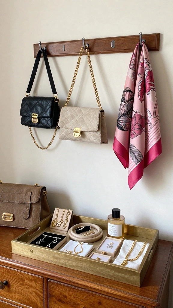 Consider using a chic jewelry stand or box for necklaces and bracelets and hang purses on wall-mounted hooks for an artistic touch. Vintage display cabinets can keep items secure while adding to the aesthetic.