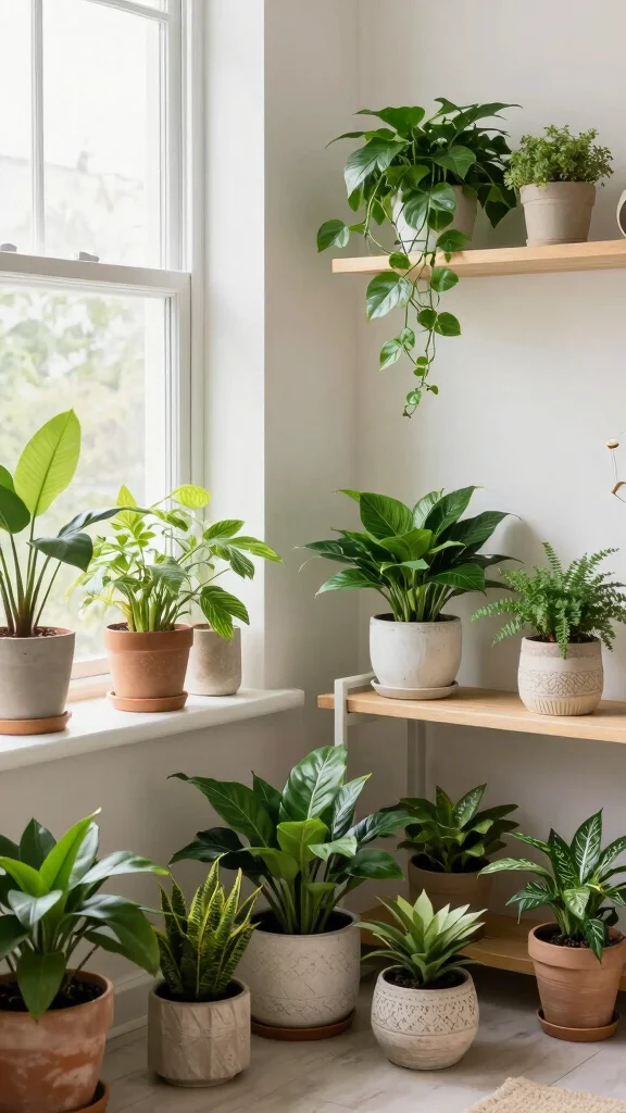 Consider snake plants or pothos for easy care, and select decorative pots that align with your decor style. Hanging plants or placing them on shelves adds visual interest and texture.