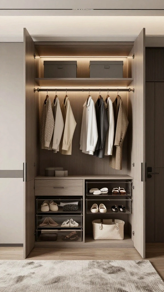 Use closet organization ideas like sortable bins, pull-out trays, and modular shelving to maximize space without visual noise. Finish with stylish storage solutions—think matte finishes, integrated lighting, and a simple mirror to extend the space.