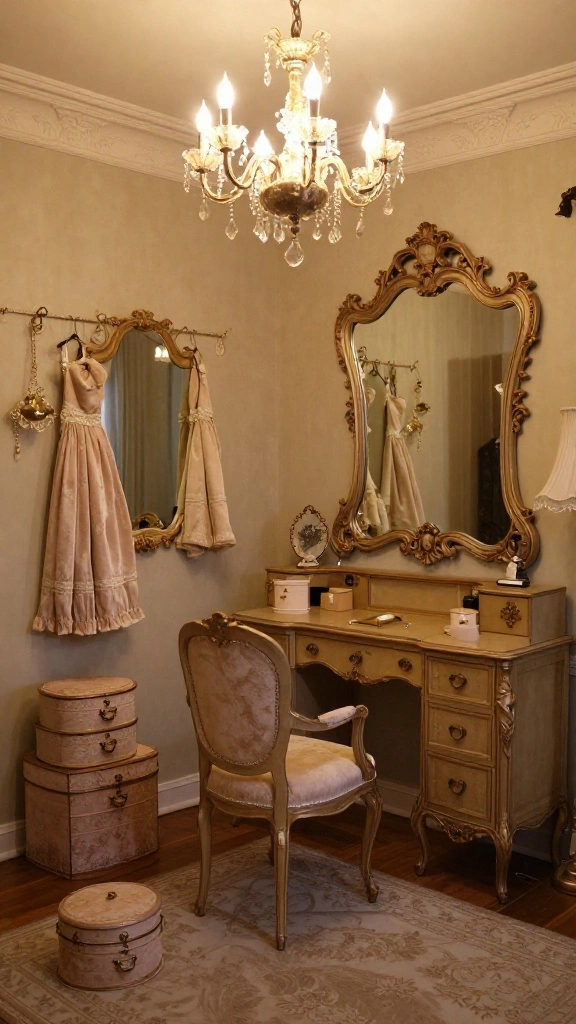 Consider using a vintage vanity with intricate details, and add a grand chandelier for a touch of sophistication. Vintage storage boxes can also help keep your items organized while contributing to the decor.