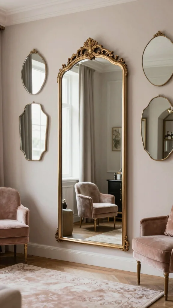 Mixing different mirror shapes and sizes creates visual interest, while ornate frames can add character. Positioning mirrors to reflect light will enhance brightness and create a more inviting atmosphere.