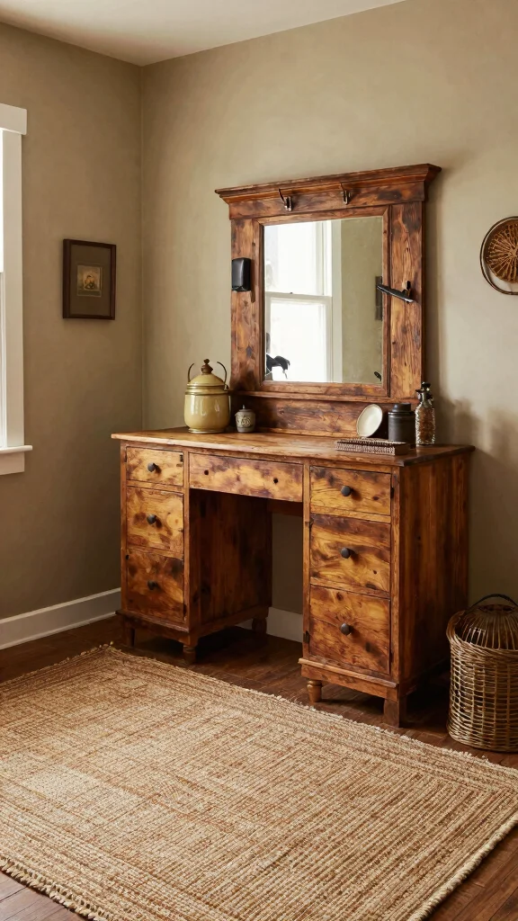 Incorporate a farmhouse-style dressing table, use vintage crates for storage, and add wool or jute rugs to introduce texture. These elements work together to create a cozy environment.