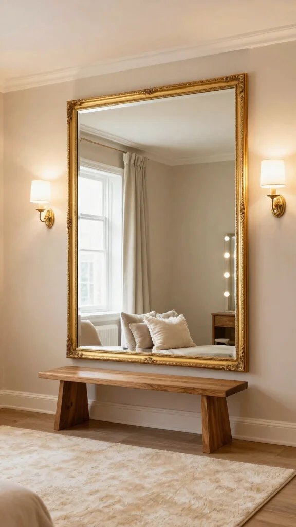 Fun fact: A floor-to-ceiling mirror can double the perceived space by reflecting natural light—perfect for your dressing room mirror ideas. With oversized glamour, you’ll notice brighter mornings and a room that feels twice as big—positioned wisely to catch natural light.