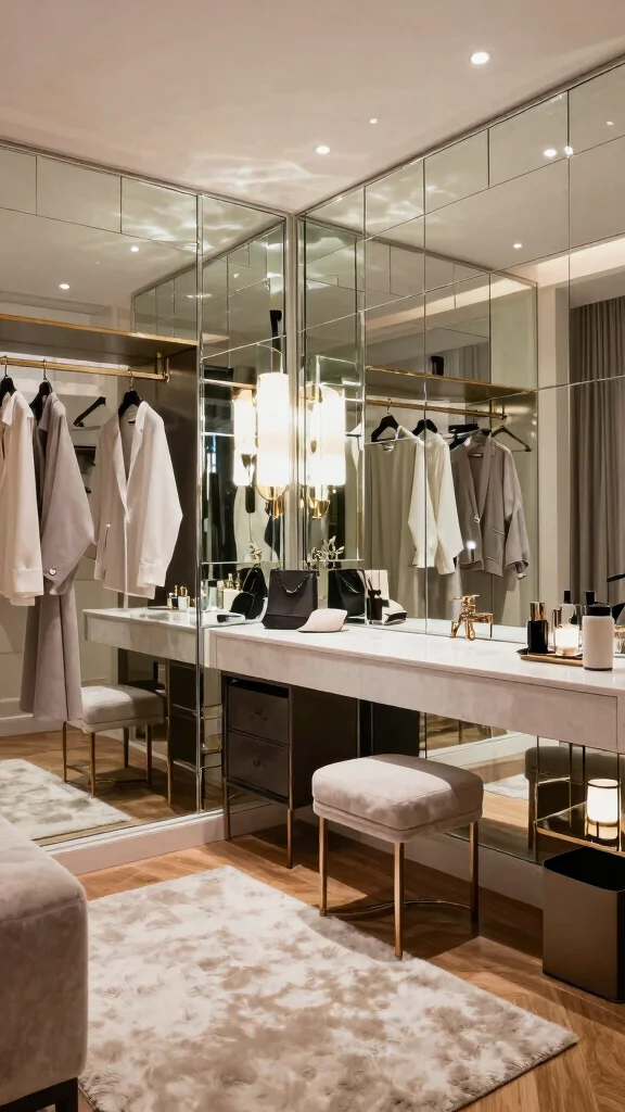 Use floor-to-ceiling mirrors along one wall or a pair of tall mirrors opposite each other to create the illusion of space. Choose a large vanity mirror ideas with a slim frame to maximize visible area. Consider mirrored doors or a wall of mirrors to bounce light and expand perception. Avoid clutter around the mirrors; keep surfaces clean to maintain a sleek dressing room design.