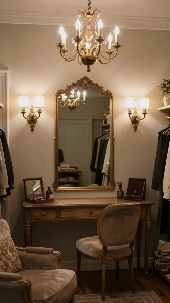 Vintage-inspired lighting can imbue your dressing room mirrors with timeless charm. Consider using Edison bulbs, ornate chandeliers, or elegant sconces that complement your mirrors beautifully. These lighting choices create a soft, flattering glow ideal for skincare and makeup applications.