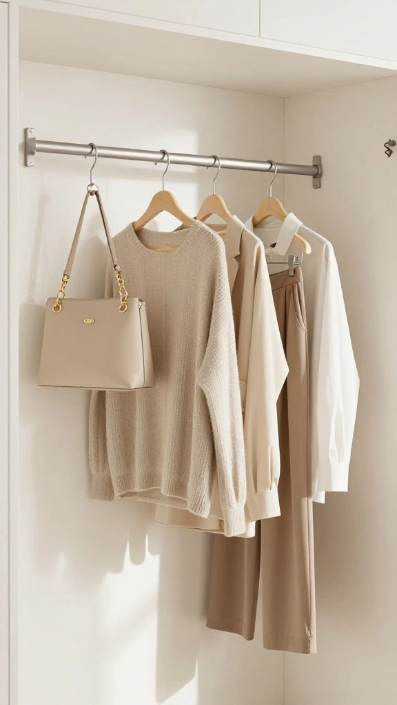 To maximize your minimalist hanging solutions, try these tips. Organize clothes by category—dresses on one rail, jackets on another—to simplify your wardrobe. Incorporate mirrors or wall art to reflect light and create a more spacious atmosphere. Regularly edit your wardrobe to keep only your favorite pieces readily accessible.