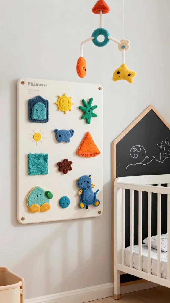 Incorporating interactive features into your nursery encourages engagement and stimulates your baby’s development. Consider adding a wall-mounted activity board filled with textures, colors, and shapes for sensory exploration. Soft hanging toys can provide entertainment, while a mini chalkboard wall offers creative opportunities as your child grows. These features not only add personality to the space but also promote hands-on learning and exploration.