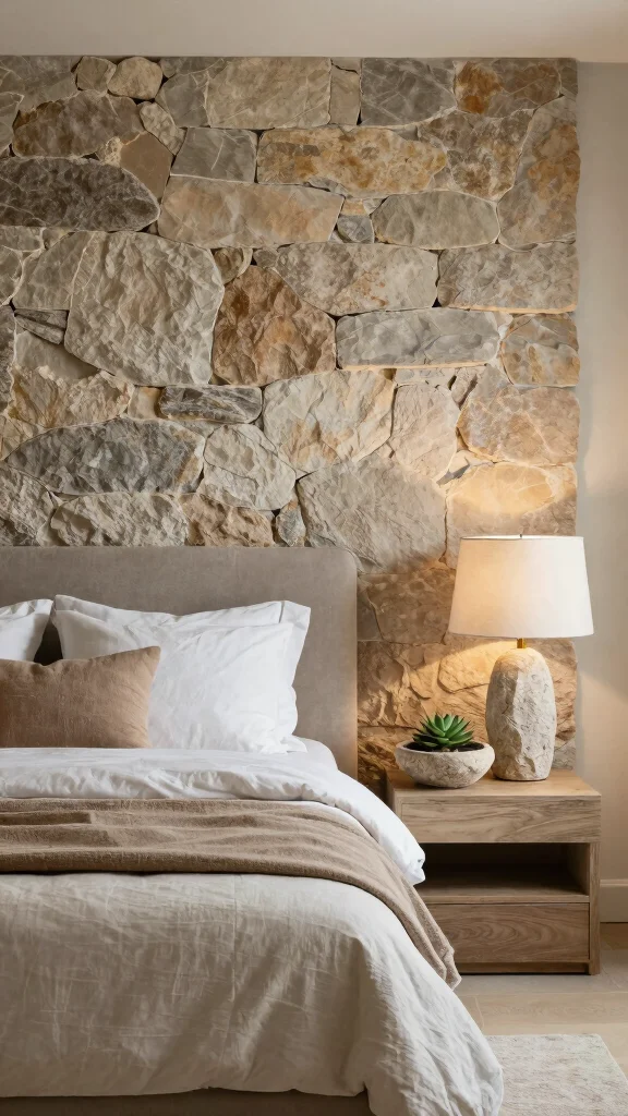 Choose decorative stone bowls to hold small items or plants, and consider a stone accent wall behind the bed for a striking focal point. Earthy stone decor pieces can beautifully align with your overall color scheme.