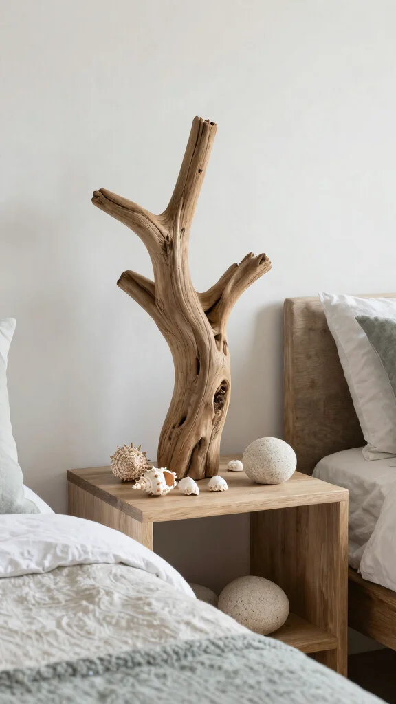 Consider these creative ideas: use driftwood as a one-of-a-kind coat rack or artwork, create a seashell centerpiece for the bedside table, or incorporate stone sculptures for added visual interest.