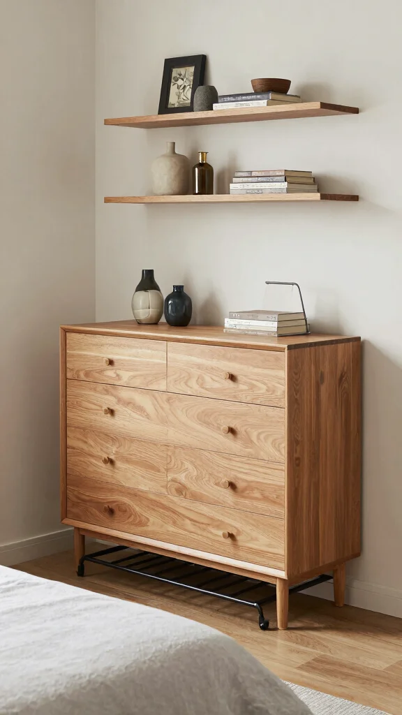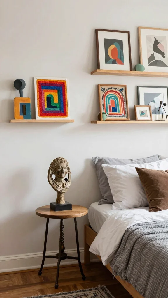 Use vertical storage and floating shelves to keep surfaces clean while adding decorative accents for bedrooms like framed art and greenery.