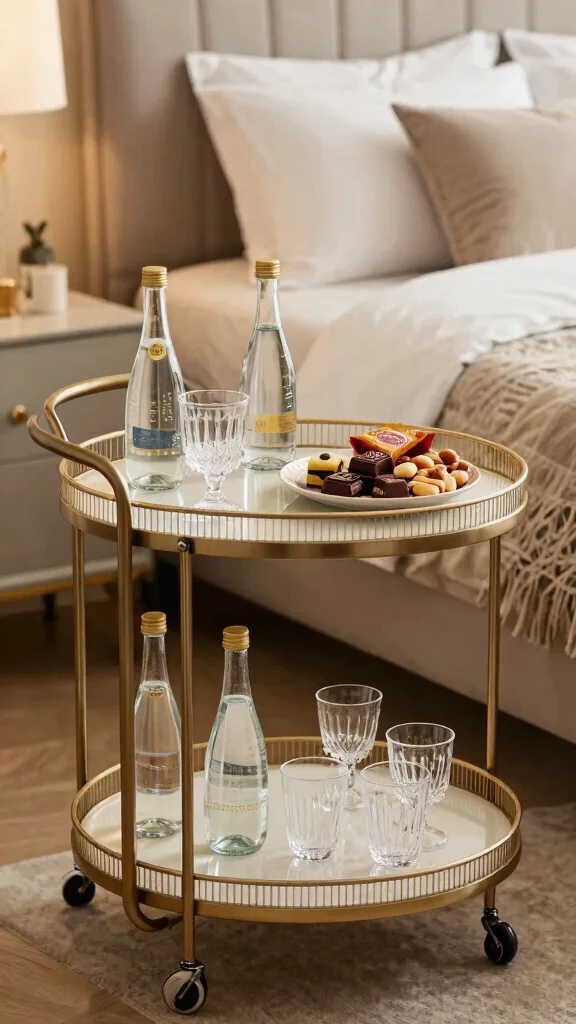 Enhance your guests’ experience with a customizable mini bar that makes them feel at home. Use a stylish cart or an elegantly arranged tray to hold a selection of drinks, snacks, and glassware. This thoughtful addition allows guests to enjoy refreshments at their leisure, adding to their comfort.