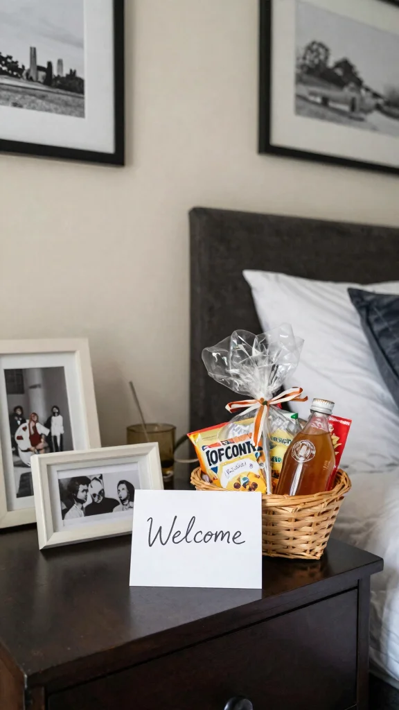 Include a variety of options—sparkling water, assorted teas, and local snacks—to give them a taste of the area. A handwritten welcome note can add a personal touch to this delightful setup.