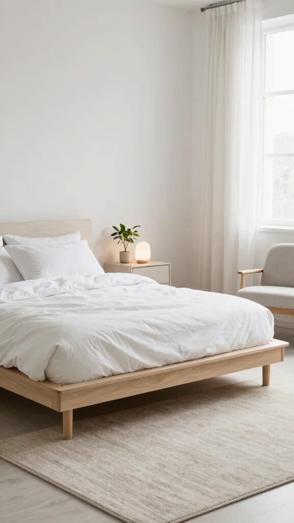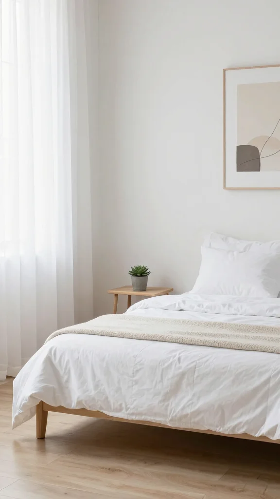 To implement this serene look, opt for a low-profile bed that allows the room to breathe. Budget-friendly choices include thrifted or DIY decor that retains a clean aesthetic. Embrace natural light with sheer curtains, enhancing the inviting atmosphere.