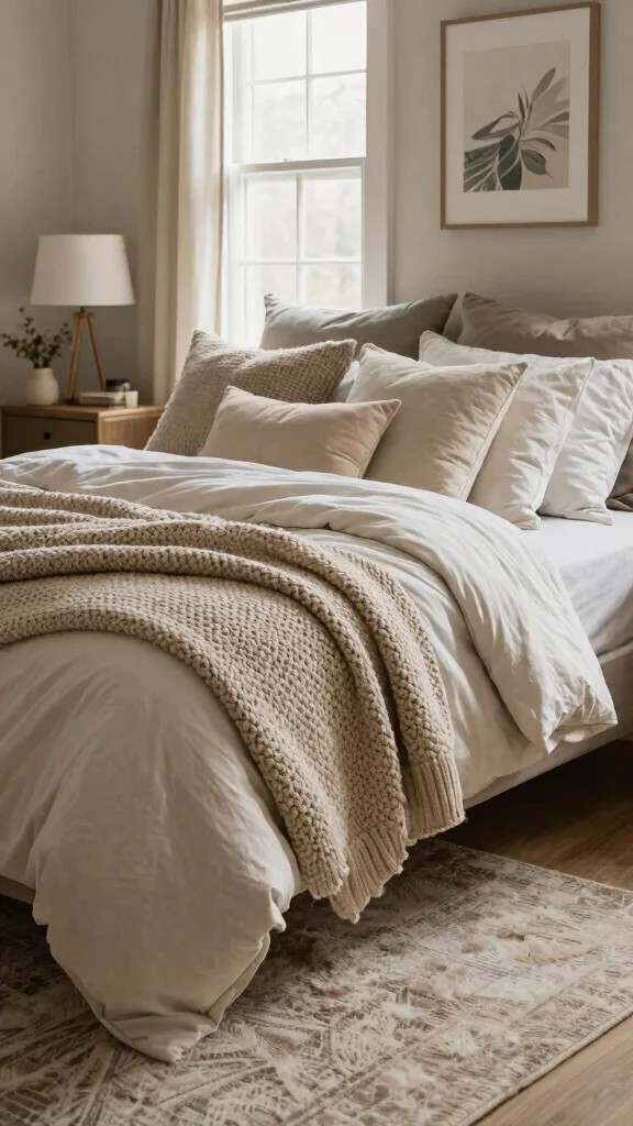 – Layer materials like wool and linen for a cozy bedroom atmosphere.