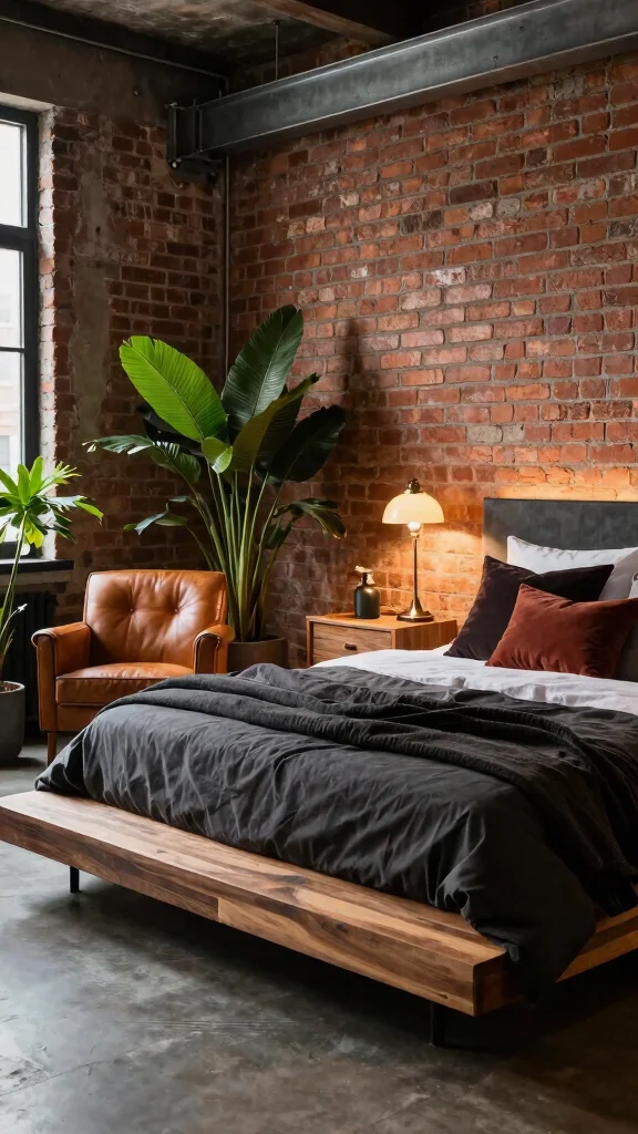 Transform your guest bedroom with an industrial style that remains cozy and inviting. Exposed brick walls paired with metal accents create a bold backdrop for softer furnishings. Picture a platform bed dressed in crisp bedding, accented with plush pillows and a warm area rug to soften the industrial edges.