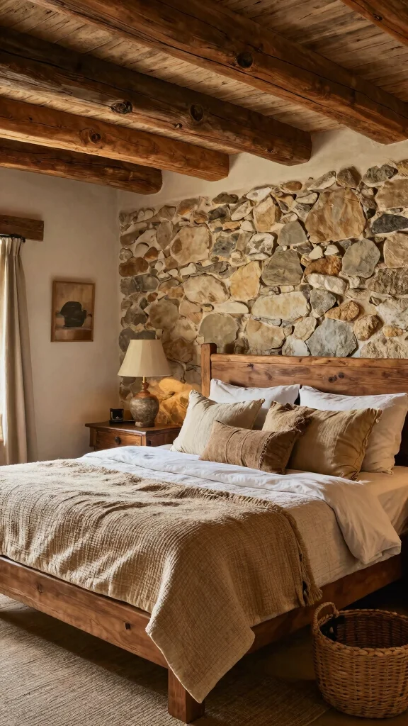 Capture the charm of a rustic retreat in your guest bedroom, perfect for lovers of country living. Wood beams, stone accents, and warm colors converge to create an inviting space. Imagine a sturdy wooden bedframe layered with a cozy quilt, surrounded by flannel and wool textiles that beckon for comfort.