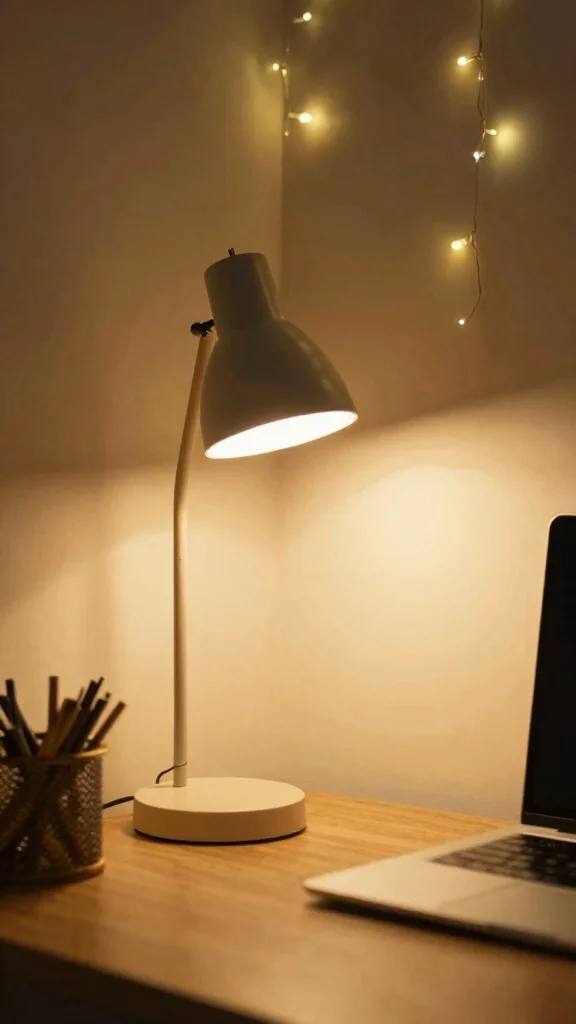 Create a simple layout with layered lighting: a bright desk lamp for work, a warm bedside light for guests, and soft ambient light to mellow the room.