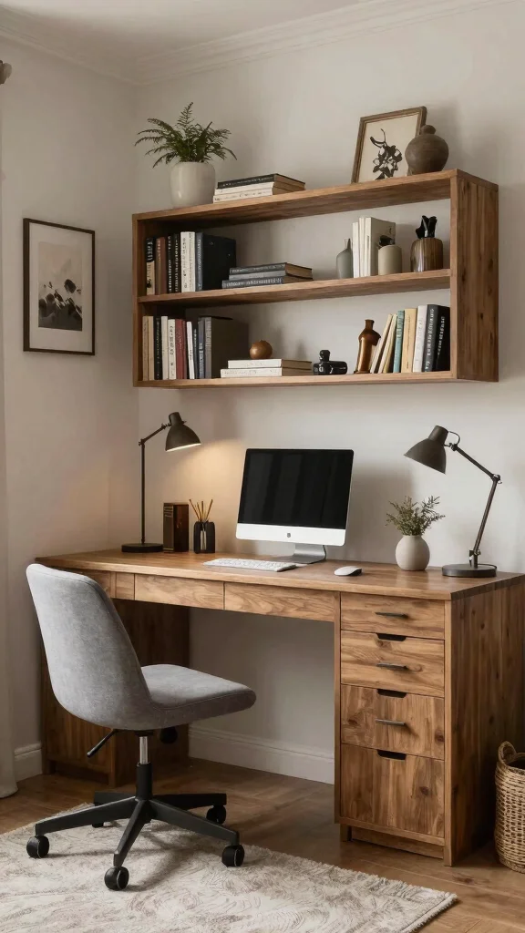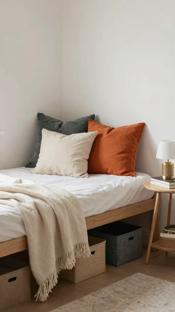 Accessorizing with multifunctional items can elevate both style and practicality in a small room. Consider decorative baskets that store work supplies during the day and bedding at night. A chic ottoman can serve as extra seating or a footrest while you work. Tip: Choose accessories that reflect your personal style and contribute to the room’s overall theme.