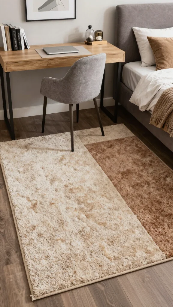 Area rugs offer a stylish method to delineate different areas within a multifunctional room. Positioning a rug under the desk can create a cozy workspace, while another near the bed enhances the sleeping area. This visual separation adds warmth and texture to the room. Tip: Select durable rugs that are easy to clean, ideal for high-traffic zones.