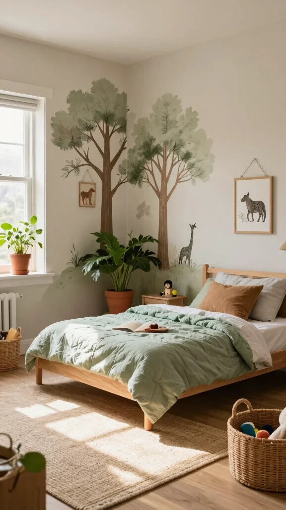 To bring this theme to life, consider using reclaimed wood for beds and dressers, paired with organic cotton bedding that features playful floral or animal prints. Wall decals of trees or clouds can further enhance the theme without overwhelming the space.