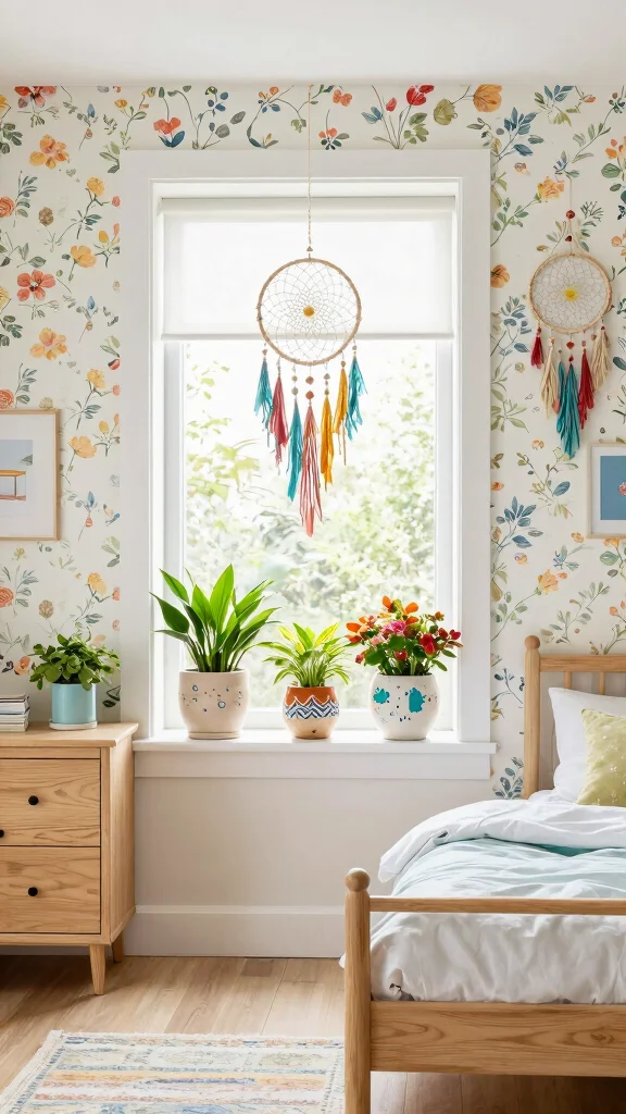 Accent the room with décor made from natural materials like wooden toys, rattan furniture, or ceramic planters. Hanging dreamcatchers or mobiles inspired by nature can add texture and whimsy to the room.