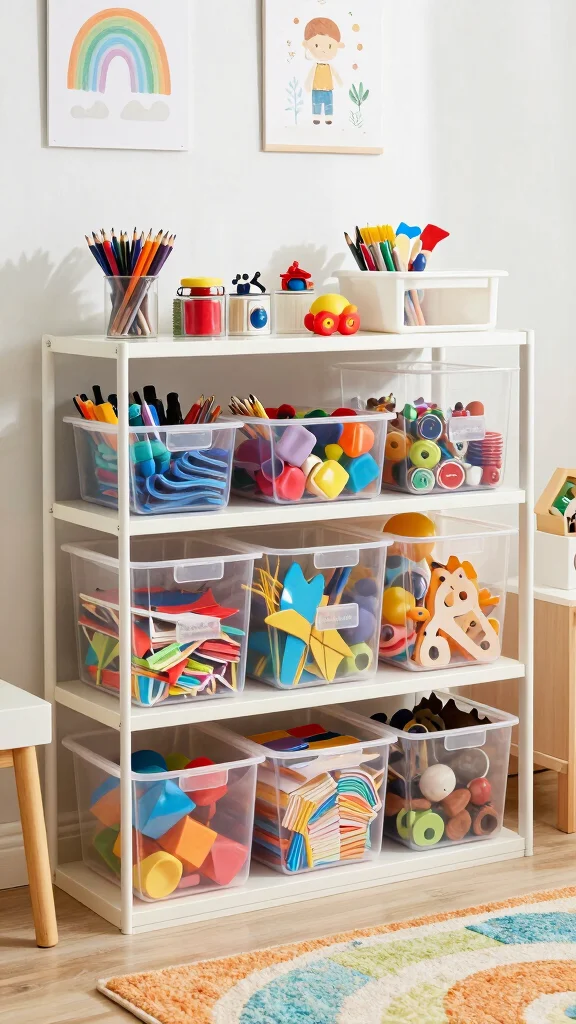Opt for clear storage containers to easily see what’s inside, making them excellent for organizing small items like art supplies and LEGO pieces. Transparency encourages kids to access what they need quickly, fostering a habit of organization.