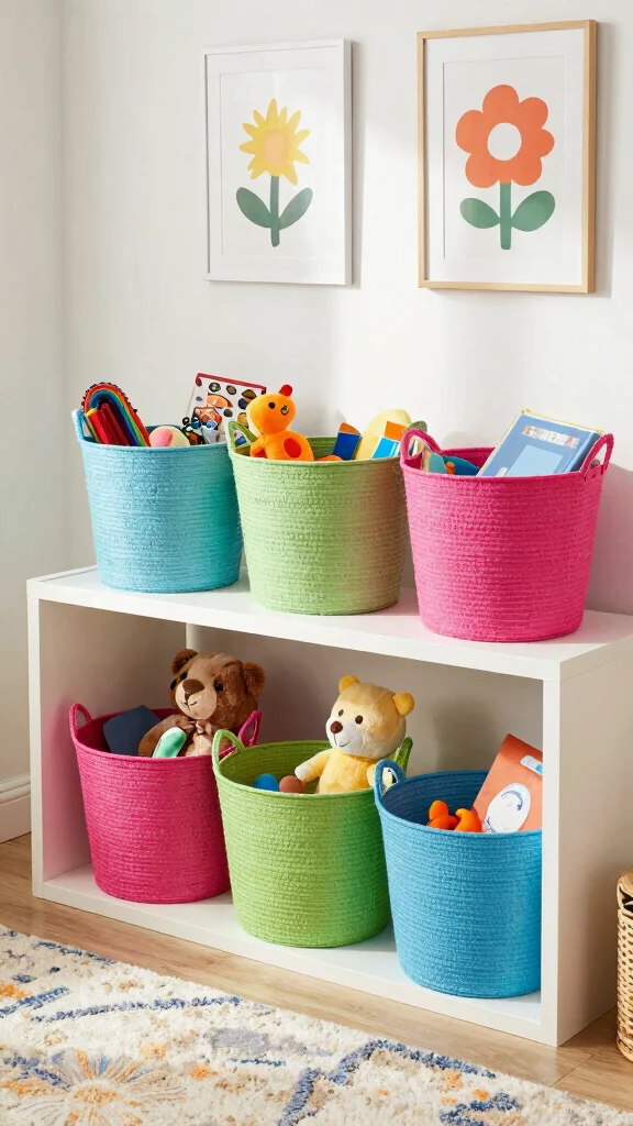 Introduce a splash of joy into storage with colorful baskets. These vibrant containers can hold everything from stuffed animals to art supplies, making them a delightful addition to any room’s decor.