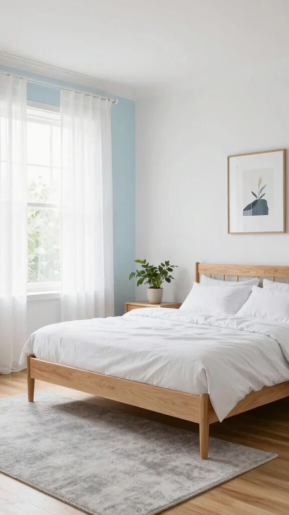 To bring this refreshing palette to life, consider painting an accent wall in a light pastel or a subtle neutral. Incorporate natural wood elements, such as a rustic bedside table, to add warmth and balance to the soft colors.