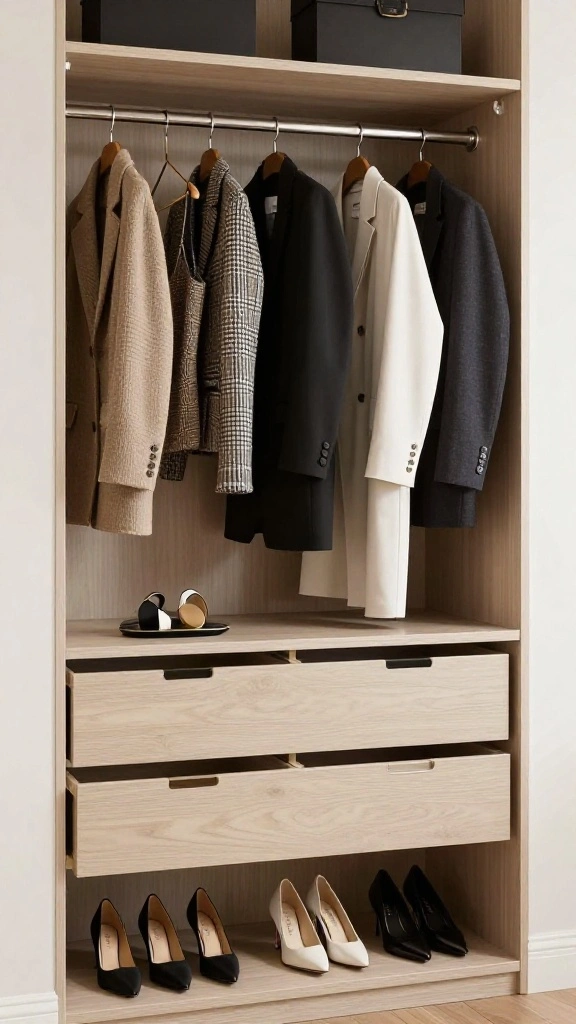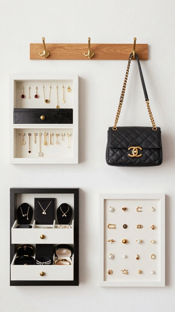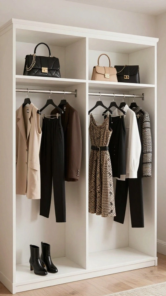 To maximize both style and organization, consider incorporating varied storage heights and open shelving. This allows you to showcase beautiful handbags while keeping other items neatly tucked away, maintaining a clutter-free environment.