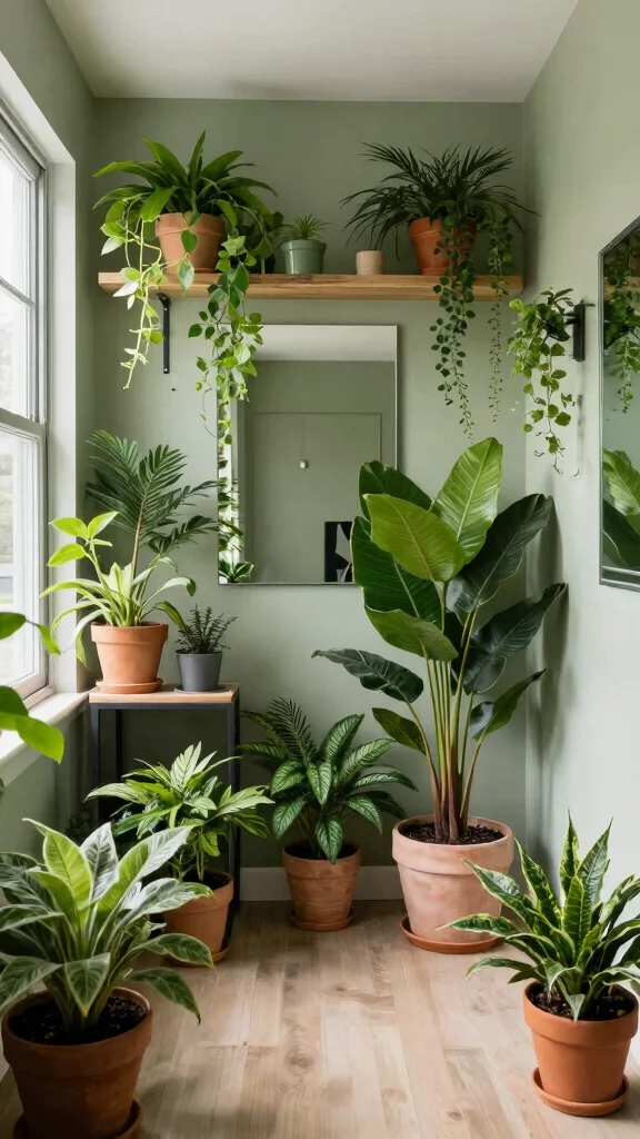 Choose decorative planters that align with your room’s aesthetic, arranging plants at varying heights for added visual interest. This will create a lively and inviting atmosphere.