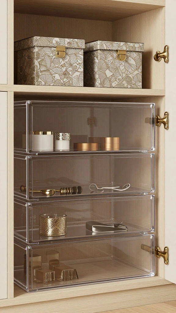 Stylish storage solutions can seamlessly blend functionality with aesthetics in your dressing room. It’s possible to keep your space organized while ensuring it looks chic and inviting. Imagine clear acrylic drawers that allow you to see your accessories at a glance, paired with elegant storage boxes that enhance your decor.
