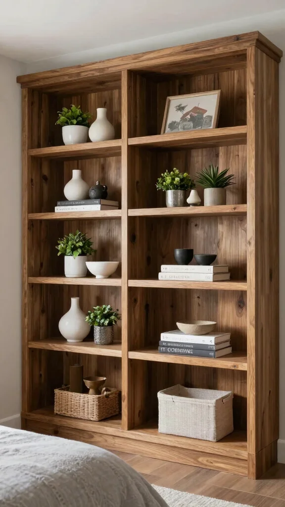 Open shelving can be both a functional and stylish addition to your master bedroom. Use wooden shelves to display decorative items, books, or plants, adding character while keeping essentials within easy reach. This approach fosters a personal touch while maintaining an organized appearance.