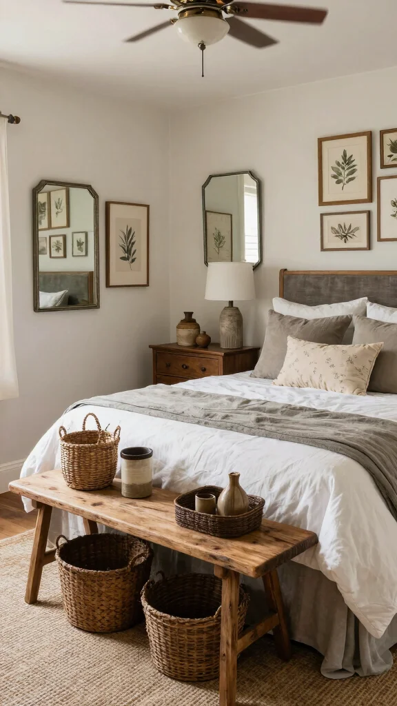 Accessories are vital in defining the farmhouse style of your master bedroom. Think about incorporating rustic decor items such as wooden trays, vintage books, or woven baskets. These elements not only enhance the aesthetic but also serve functional purposes, adding charm to your space. A wooden bench at the foot of the bed provides both style and practicality, while a collection of vintage mirrors can reflect light, making the room feel larger.