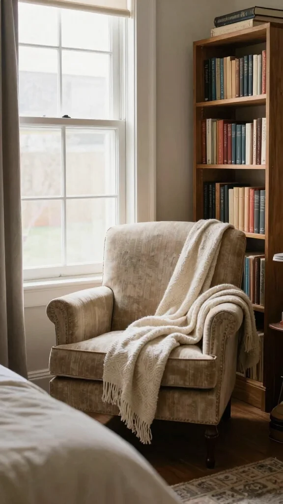 Complete your reading nook with a soft throw blanket and a small side table for your cup of tea or coffee, making it an inviting space to unwind. Choose vintage-inspired furniture to align with the farmhouse style while creating a cozy atmosphere for nighttime reading.