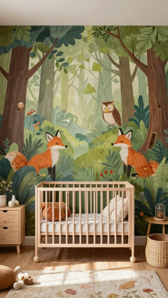 Imagine bringing the serene beauty of a forest into your nursery with a cozy woodland mural. This design element captures the charm of nature, featuring playful animals like foxes and owls nestled among lush trees, creating a magical space that inspires your child’s imagination. The soothing greens and browns create visual harmony, making the area feel tranquil and inviting.