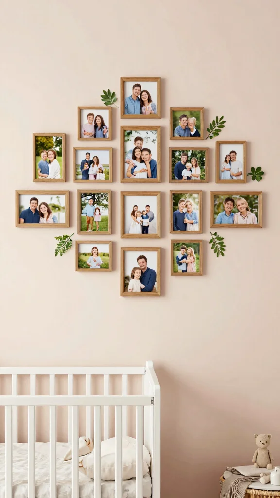 This design allows for creative display, and the arrangement can evolve as your family grows. Using eco-friendly frames made from reclaimed wood adds to the sustainable approach.