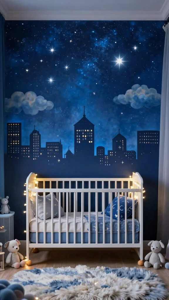 A starry night skyline accent wall creates a magical atmosphere in your nursery, evoking a sense of wonder. Achieve this look with a deep blue background and white stars, or opt for glow-in-the-dark decals that come to life at night, enhancing the calming bedtime routine.