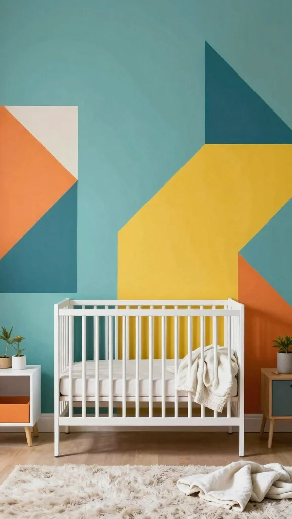 Bold geometric shapes can add a playful energy to your nursery, creating a stimulating environment that sparks creativity. Using eco-friendly paint, you can design vibrant triangles, circles, or abstract patterns that contrast beautifully with the rest of the room.