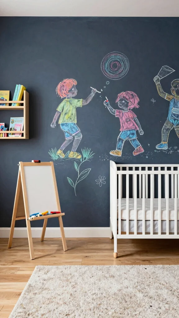 A chalkboard accent wall introduces an interactive element to your nursery, inviting creativity and play. By painting a section of the wall with chalkboard paint, your little one can draw, write, and explore their artistic side while adding a personal touch to the decor.