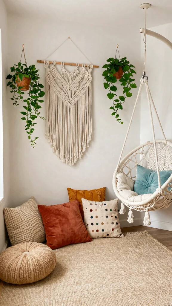 Arranging cushions in various sizes encourages relaxation, while including plants adds a fresh touch to the decor. A hanging chair can serve as a whimsical addition, perfect for cozy reading moments or quiet reflections.