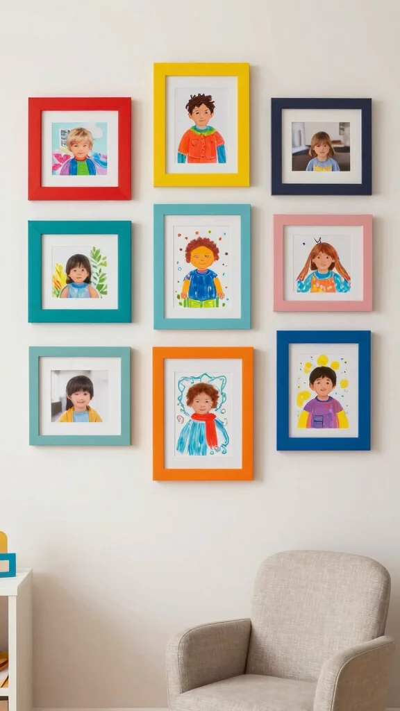 Choose frames that not only fit your design style but also keep safety in mind. This art display can serve as a meaningful backdrop for memorable moments, aligning with the trend of personalized and meaningful decor that resonates with families. You can easily update the artwork as your child creates new masterpieces, making this space truly unique.