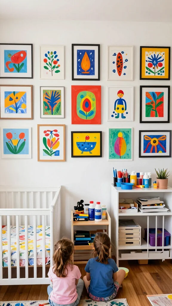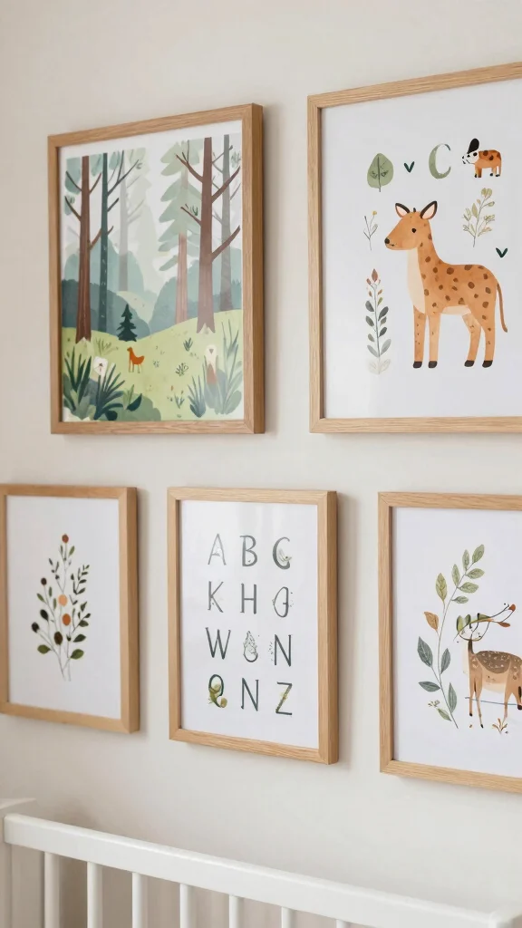 To enhance this look, mix various frame styles and sizes, adding depth and interest to your gallery wall. Incorporating educational pieces, like a vibrant animal alphabet or botanical illustrations, can enrich your child’s learning experience while beautifying the space.