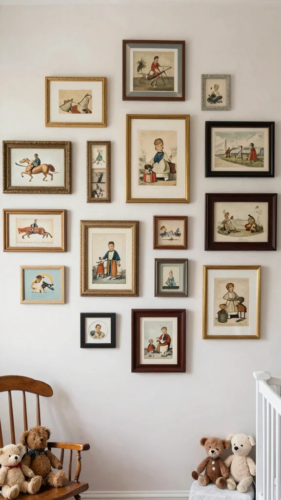 Incorporate vintage finds and antique frames into your nursery gallery wall to evoke a charming, nostalgic feel. Sourcing second-hand frames not only adds character but also supports sustainable decorating practices. Fill these frames with vintage illustrations, postcards, or heirloom pieces, creating a delightful narrative that your child can appreciate as they grow.