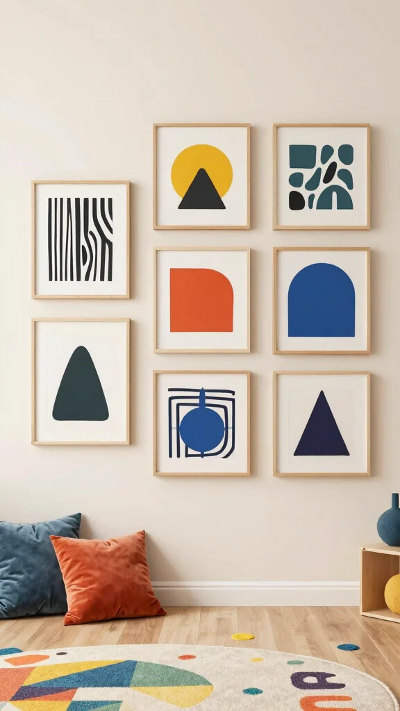 Embrace shapes to spark tiny minds, with geometric designs and playful patterns that elevate your nursery gallery wall ideas. Choose art and frames from eco-friendly materials, and invite older siblings to craft shapes from recyclable scraps for a personal, sustainable touch.