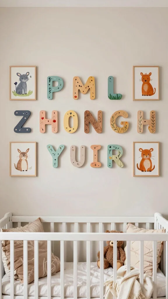 Personalize your nursery gallery wall ideas with simple letter art—wooden letters in soft pastels, or initials in felt. It’s amazing how a few thoughtful pieces transform the room into their own story. Start with a name banner and build around complementary artwork for harmony.