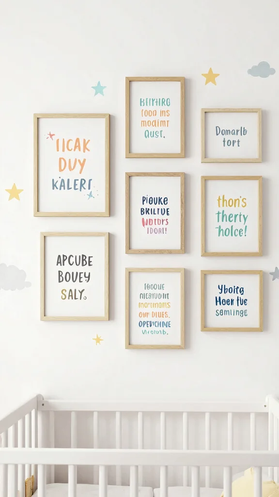 Incorporate uplifting quotes and affirmations that resonate with your family, enriching your nursery’s atmosphere. This thoughtful gallery wall idea delivers positive messages that promote a loving environment for your child. Choose eco-printed canvases or wooden signs sourced sustainably, and consider making a rotating board for changing quotes as your child’s understanding grows.
