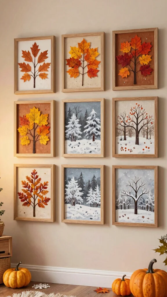 Keep your nursery lively and engaging with seasonal decor changes that celebrate the beauty of each time of year. This approach not only refreshes the gallery wall but also introduces your child to the wonders of nature’s cycles. Display fall-themed artwork with pumpkins and leaves or winter scenes featuring snowflakes and holiday cheer for a delightful seasonal touch.