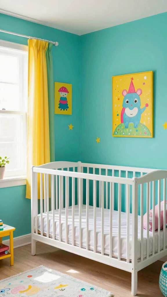 Add an accent wall in a cheerful nursery themes color like blush, mint, or sunshine yellow to bring playful energy without overwhelming the space.