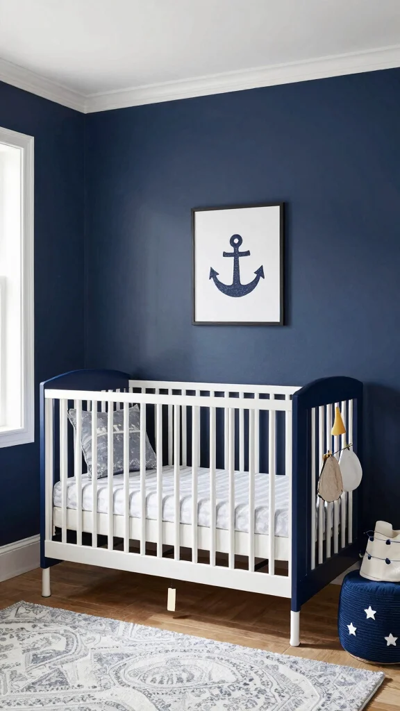 Classic navy is an elegant choice for a nursery, providing a rich and timeless backdrop. This deep color creates a sophisticated look when paired with soft whites or warmer tones, adding depth to the space. Incorporating nautical or star-themed decor enhances the classic feel beautifully. Adding bright accent pieces, like cushions or toys, can lighten the mood and create a playful atmosphere.