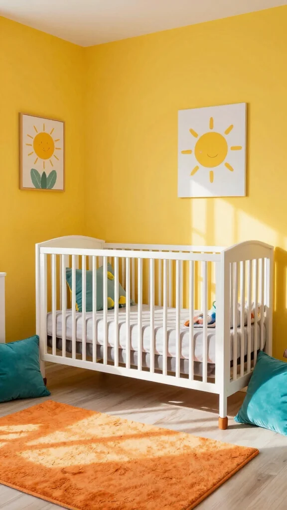 For implementation, consider using non-toxic, low-VOC paint to ensure a safe environment. You can also mix in whimsical decor elements like sun-shaped pillows or cheerful wall art to match the sunny theme. Bright accents can offer a playful contrast while maintaining a joyful ambiance.